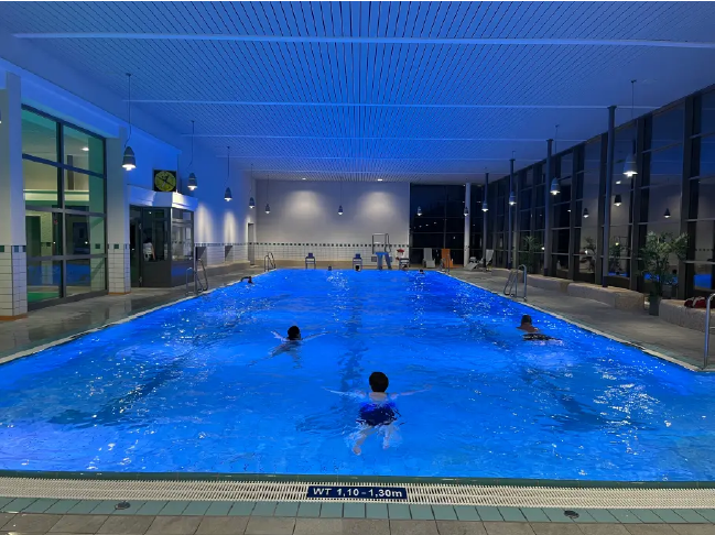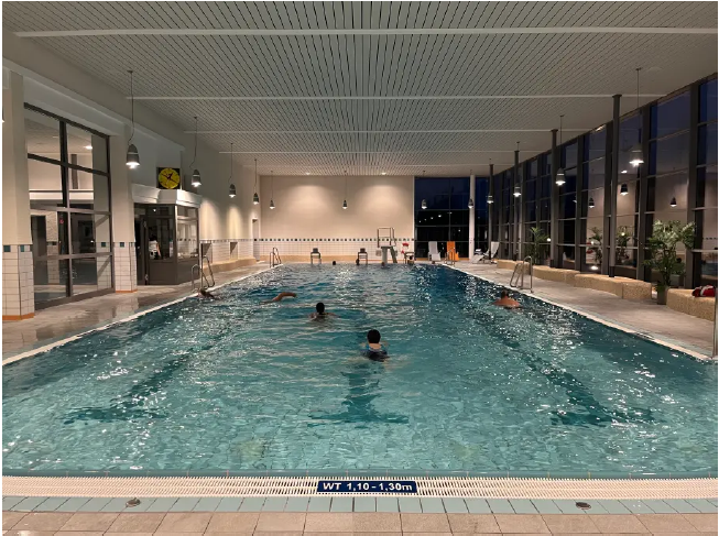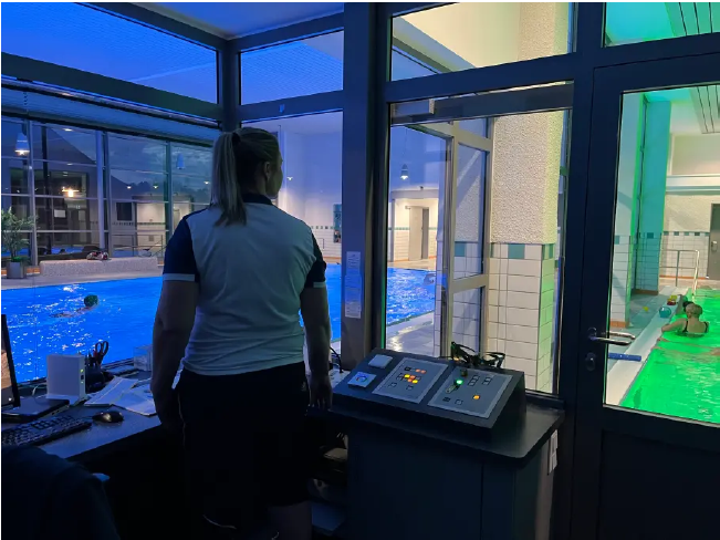 Kurze Zeit später leuchtet das Wasser des Multifunktionsbeckensnicht mehr rot, sondern blau. Durch die moderne Glaswand ist der Blick auf die etwas sportlicher gesinnten Schwimmer nebenanmöglich.
